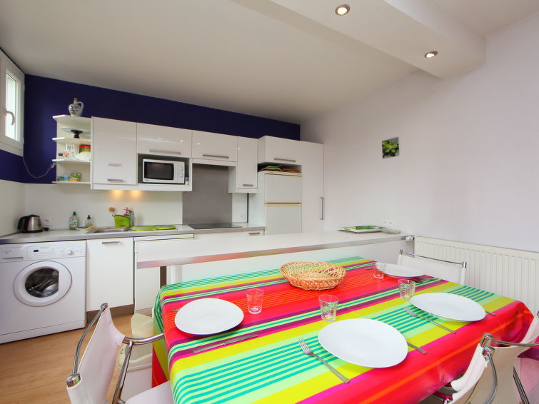 Villa 4-kamers 110 m2 op 3 verdiepingen, op het zuidoosten gelegen. Woon-/eetkamer met TV (Flatscreen TV). Uitgang naar de tuin. 1 kamer met 1 2-pers bed (140 cm, lengte 200 cm). Open keuken (oven, afwasmachine, 3 keramische glas kookplaten, broodrooster, waterkoker, magnetron, diepvriezer, elektrische koffiemachine) met doorgeefluik. Douche, aparte WC. Gas-verwarming. Bovenverdieping: 1 kamer met 2 bedden (90 cm, lengte 190 cm), wastafel en douche. Uitgang naar het terras. 2e Verdieping: 1 kamer met 1 2-pers bed (2 x 80 cm, lengte 190 cm), wastafel en aparte WC. Parketvloeren. Terras 30 m2, tuin 200 m2. Terrasmeubelen. Ter beschikking: wasmachine, strijkijzer. Internet (Internet (WiFi), extra). Parkeerplaats (omheind). Rookvrij huis. Rookmelders. 14640990995AB