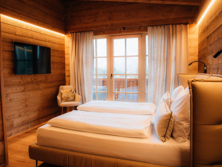 "Sissis green Chalets", chalet 16-kamers. Luxueus en met veel hout ingericht: hal. 4 2-pers. kamers, elke kamer heeft douche/WC, TV en Digitale TV (Flatscreen TV). Groot woonkeuken (afwasmachine, 4 inductiekookplaten, broodrooster, waterkoker, magnetron, elektrische koffiemachine, kookeiland) met eettafel, open haard, TV en Digitale TV (Flatscreen TV), elektrische rolluiken. Uitgang naar het terras. Bovenverdieping: 8 2-pers. kamers, elke kamer heeft bad/douche/WC, TV en Digitale TV (Flatscreen TV). Uitgang naar het balkon. 4 groot terrassen 25 m2. Terrasmeubelen, barbecue, ligstoelen. Mooi uitzicht op de bergen. Ter beschikking: wasmachine, sauna, haardroger. Internet (WiFi, gratis). Parkeerplaats. Rookvrij huis.
