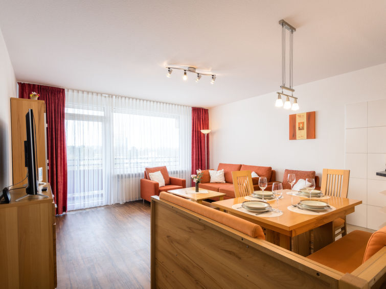 "Lahneck (B1013)", appartement 2-kamers 56 m2 op de 10e verdieping, op het westen gelegen. Het objekt is geschikt voor 2 volwassenen + 2 kinderen. Mooi en modern ingericht: woon-/eetkamer met 1 2-pers divanbed (150 cm, lengte 200 cm), Sat-TV (Flatscreen TV). Uitgang naar het balkon. 1 kamer met 1 2-pers bed (2 x 100 cm, lengte 200 cm). Kookhoek (afwasmachine, 4 keramische glas kookplaten, broodrooster, waterkoker, magnetron, elektrische koffiemachine). Douche/WC. Balkonmeubilair. Mooi uitzicht op het landschap. Ter beschikking: strijkijzer. Internet (WiFi, gratis). Niet rokers woning. Rookmelders.