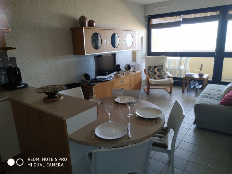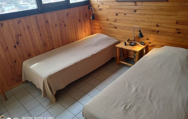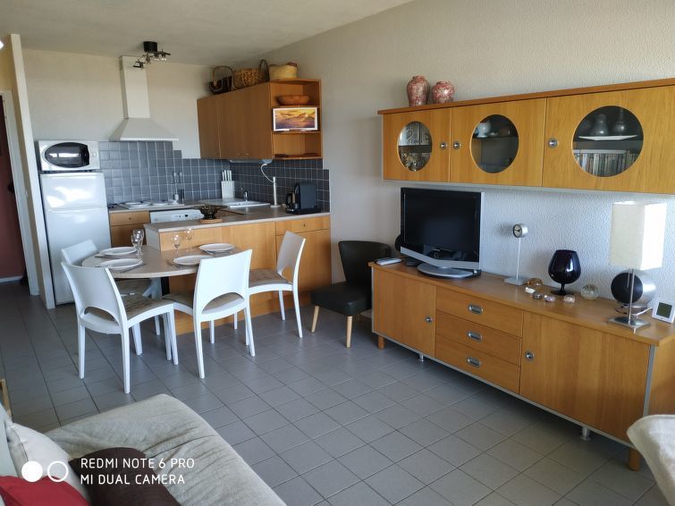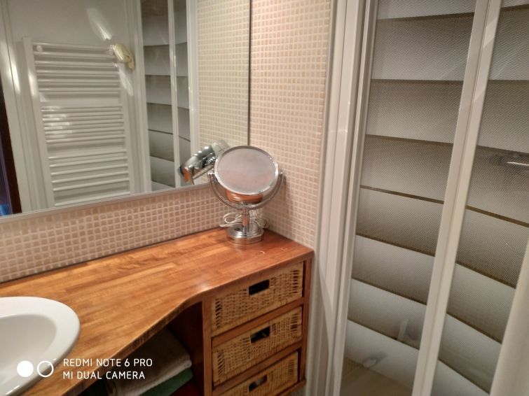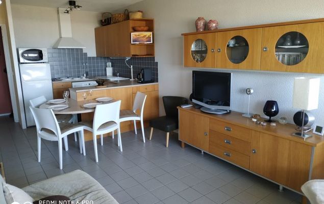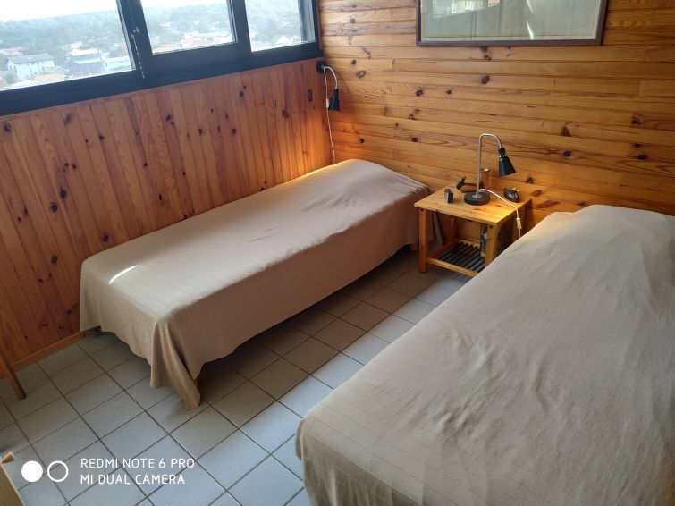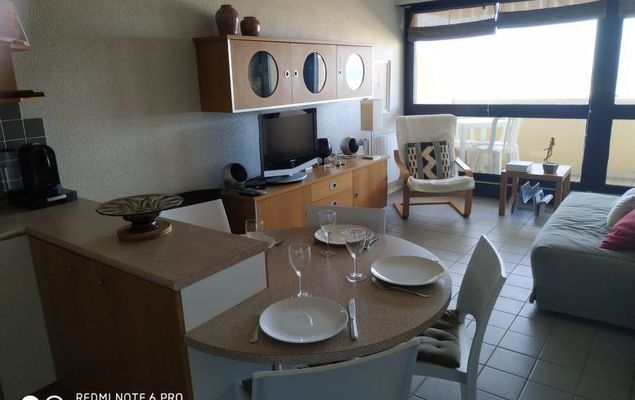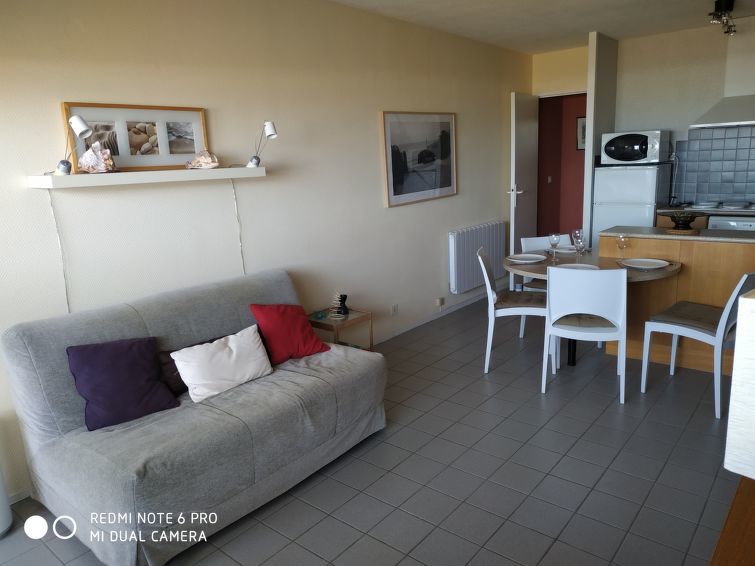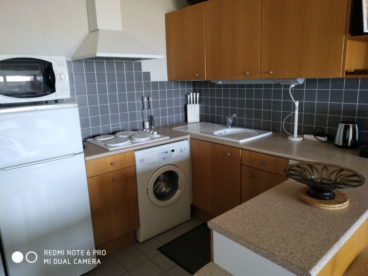Appartement 2-kamers 45 m2 op 2 verdiepingen op de 1e verdieping. 1 kamer met 2 bedden. Douche. Souterrain: woon-/eetkamer met 1 2-pers divanbed. Kookhoek (4-pits kookplaat, mini-oven). Aparte WC. Elektrische verwarming. Balkon, op het westen gelegen. Terrasmeubelen. Uitzicht op zee. Ter beschikking: wasmachine. Parkeerplaats nr. 415.