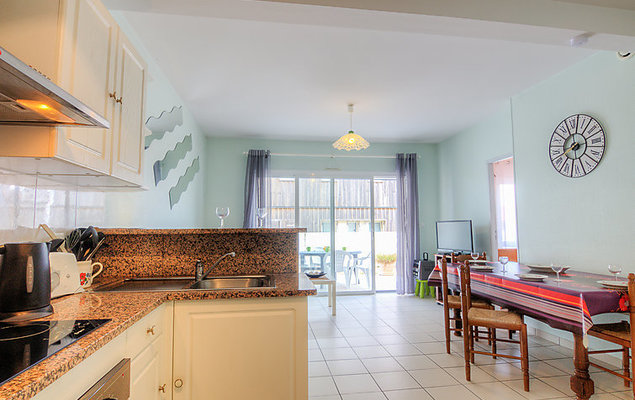 Appartement 4-kamers 59 m2, op de begane grond. Woon-/eetkamer met Sat-TV, internationale TV-zenders en stereo-installatie. Uitgang naar het terras. 1 kamer met 1 2-pers bed (1 x 140 cm, lengte 190 cm), douche. 1 kamer met 1 2-pers bed (1 x 140 cm, lengte 190 cm). 1 kamer met 2 bedden (90 cm, lengte 190 cm). Kookhoek (oven, afwasmachine, 4 keramische glas kookplaten, magnetron). Douche, aparte WC. Elektrische verwarming. Terras 50 m2 gedeeltelijk overdekt. Terrasmeubelen. Ter beschikking: wasmachine. Internet (Internet (WiFi), gratis). Parkeerplaats. Let op: maximaal 1 huisdier/hond toegestaan. Rookmelders.
