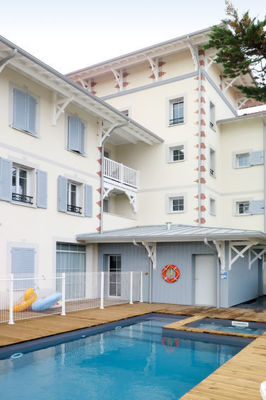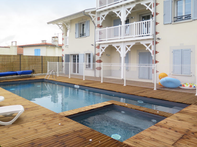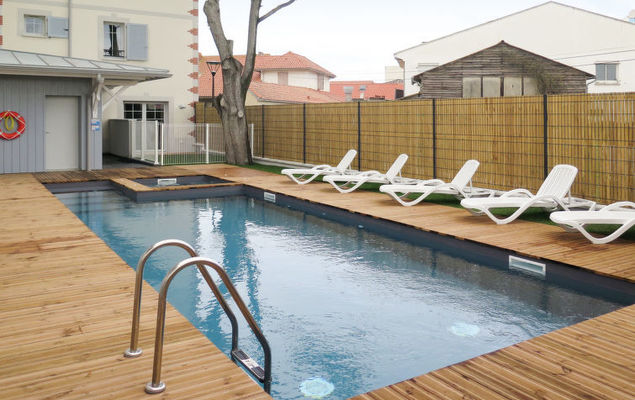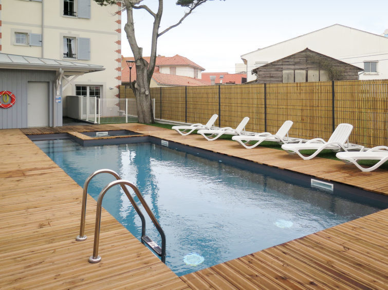 Klein vakantiecomplex "Le Marché de la Plage", van 4 verdiepingen, bouwjaar 2017. 37 appartementen in de woning. In het centrum van Mimizan-Plage, 6 km van het centrum van Mimizan-Bourg, 70 km van het centrum van Arcachon, 250 m van zee. Voor medegebruik: openluchtzwembad verwarmd, omheind (9 x 4 m, 140 cm diepte, seizoensgebonden beschikbaarheid: 25.Apr.-26.Sep.) met trap. Buitendouche, bubbelbad, terras. In het complex: receptie, internetaansluiting, Internet (WiFi), fitnessruimte, lift, bergruimte voor fietsen, wasmachine, droger (voor medegebruik, extra). Ontbijt op verzoek (extra). Gemeenschappelijke garage (extra), openbare parkeerplaatsen. Winkel 50 m, supermarkt 250 m, restaurant 50 m, zandstrand 250 m. Let op: De afgebeelde foto is slechts een voorbeeld. De huurobjecten kunnen wb. Woonoppervlak, kamerindeling verschillen.