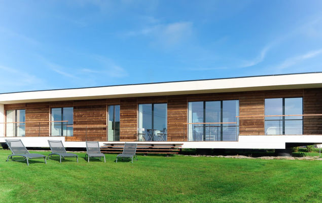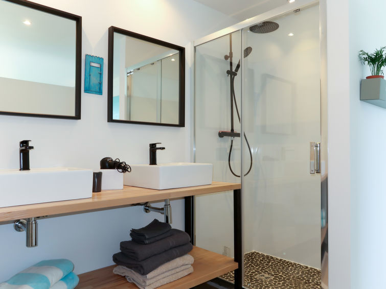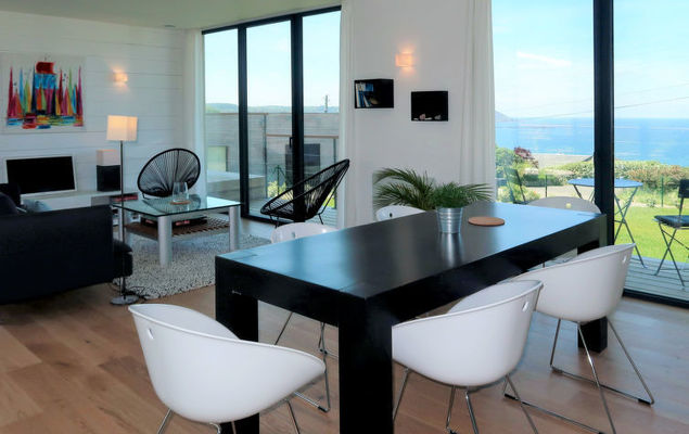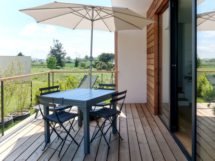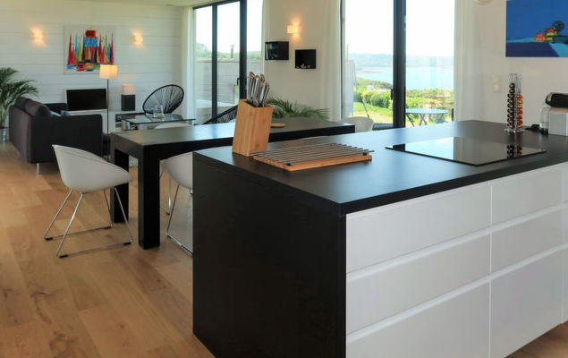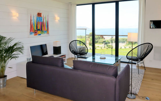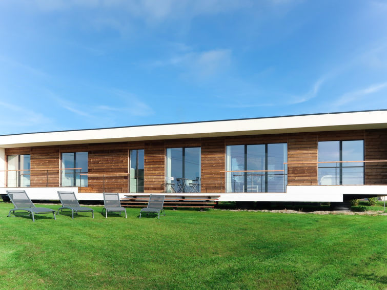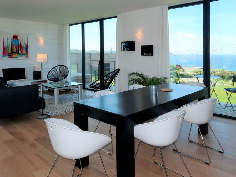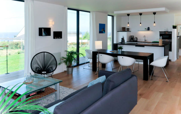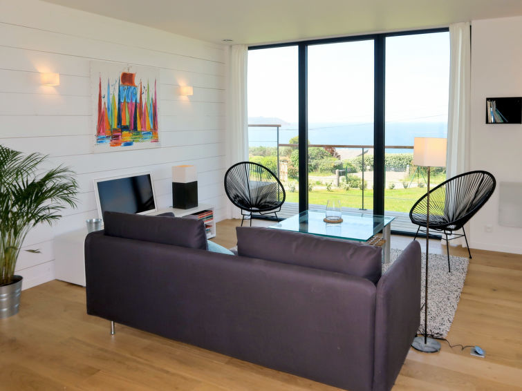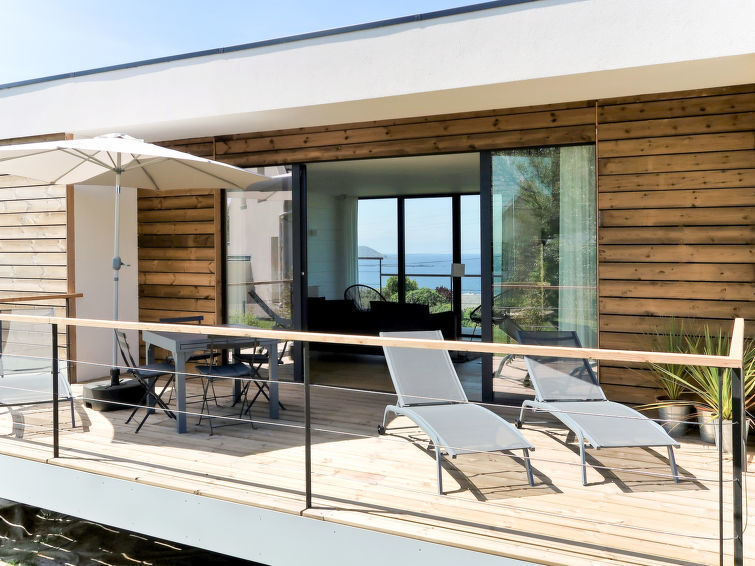 Moderne houten huis "Ty Sables", bouwjaar 2019. In de wijk Les Sables Blancs, 1.5 km van het centrum van Locquirec, 5.5 km van het centrum van Plestin-les-Grèves, 450 m van zee. Voor alleengebruik: terrein 900 m2 (omheind) met gazon, parkeerplaats (voor 2 auto's) op het terrein. Winkel 1.4 km, levensmiddelenwinkel 600 m, supermarkt 5.5 km, restaurant 1.4 km, bakkerij 1.7 km, zandstrand "Les Sables Blancs" 450 m. Golfterrein (18 holes) 32 km, surfschool 1.3 km, zeilschool 1.5 km. Attracties in de buurt: Morlaix 20 km, Lannion 20 km, Ploumanac'h, Côte du Granit Rose 35 km, Plomeur-Boudou 29 km, Huelgoat 47 km, Carnoet, Vallée des Saints 45 km.