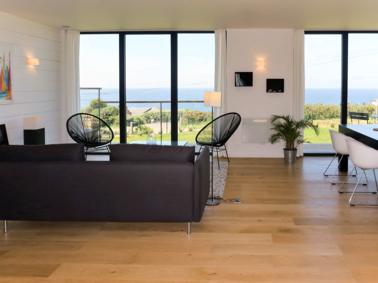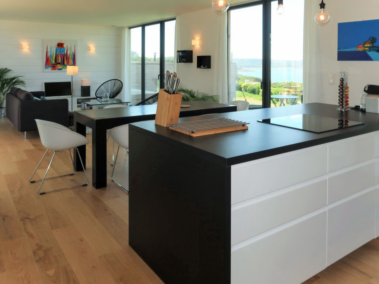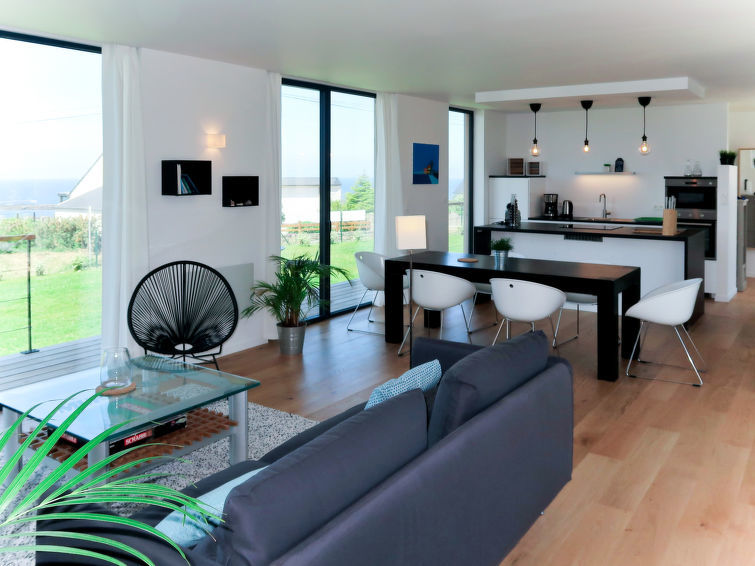 "Ty Sables (LOQ220)", huis 4-kamers 120 m2. Comfortabel en modern ingericht: woon-/eetkamer met eettafel en TV. Uitgang naar het terras. 1 kamer met 1 2-pers bed (160 cm), douche en dubbele wastafels. Uitgang naar het terras. 1 kamer met 1 2-pers bed. Uitgang naar het terras. 1 kamer met 2 bedden (80 cm). Uitgang naar het terras. Berging. Open keuken (oven, afwasmachine, 3 inductiekookplaten, broodrooster, waterkoker, magnetron, elektrische koffiemachine). Douche, 2 aparte WC's, dubbele wastafels. Elektrische verwarming. Parketvloeren. 2 terrassen. Terrasmeubelen, barbecue (verrijdbaar), ligstoelen (2), zitgelegenheid. Mooi panoramazicht op zee. Ter beschikking: wasmachine, kinderstoel, kinderbed. Internet (Internet (WiFi), gratis). Let op: rookvrij huis. 1 huisdier/hond toegestaan. Rookmelders.