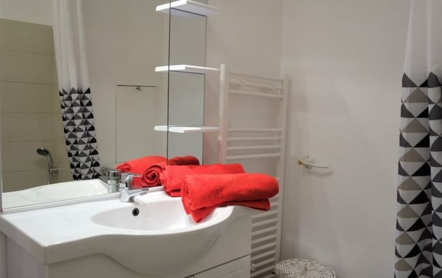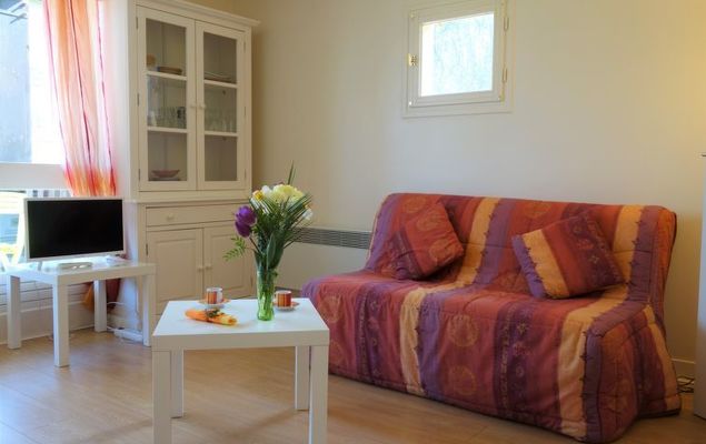Studio 1-kamer 25 m2 op de 1e verdieping. Licht, comfortabel ingericht: hal. Woon-/eetkamer met 1 divanbed (140 cm), TV (Flatscreen TV). Uitgang naar het balkon. Kookhoek in de hal (2 inductiekookplaten, broodrooster, waterkoker, elektrische koffiemachine, combimagnetron). Bad/WC. Groot balkon. Balkonmeubilair. Mooi uitzicht op de tuin. Ter beschikking: wasmachine. Internet (Internet (WiFi), gratis). Parkeerplaats. Let op: niet rokers woning.