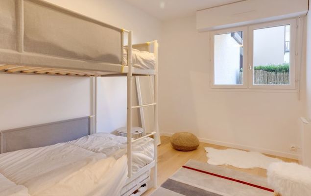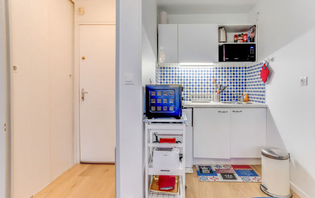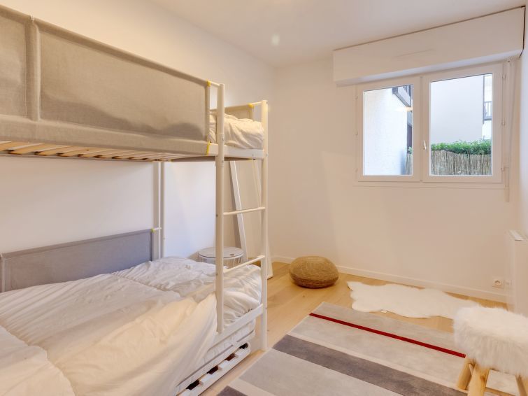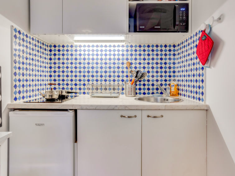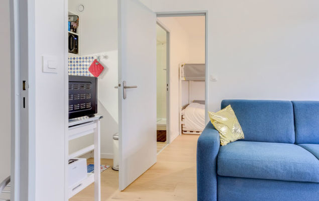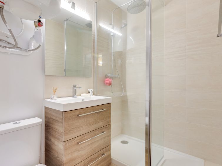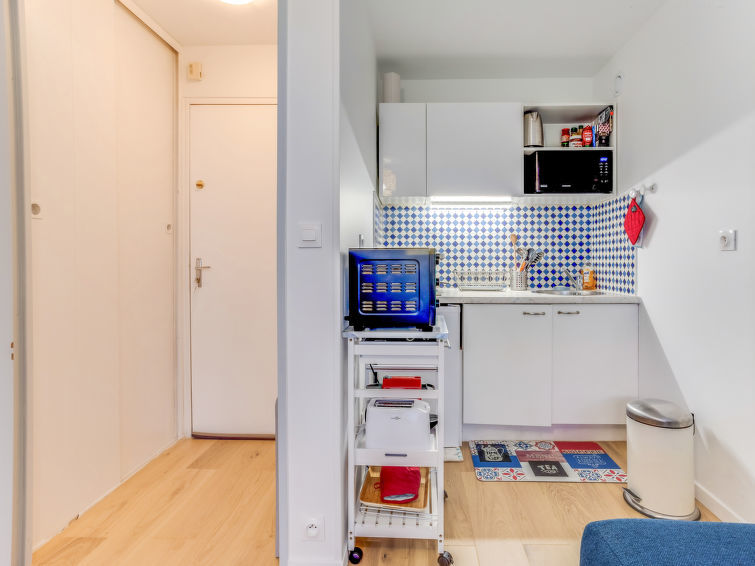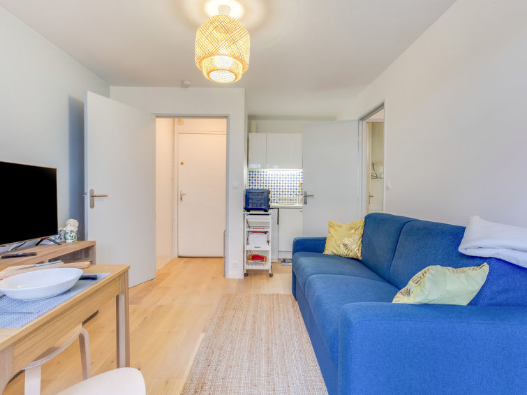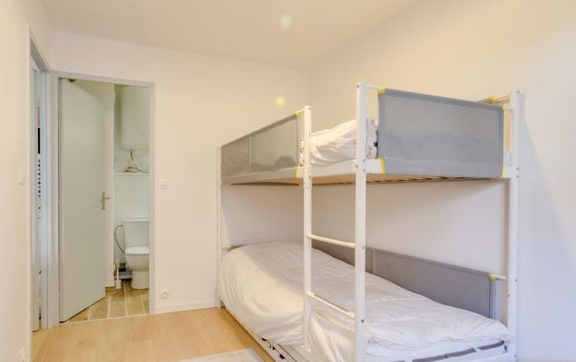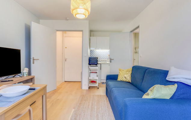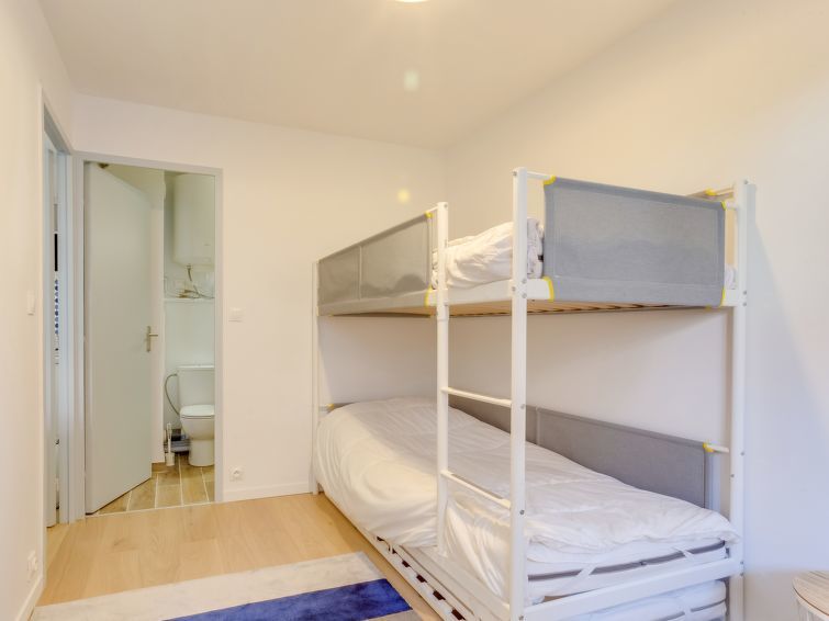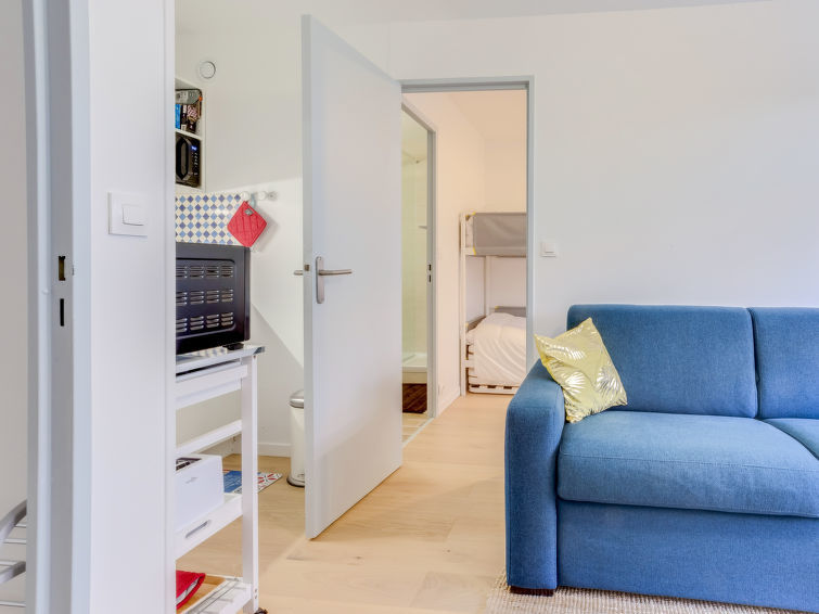 Appartement 2-kamers 28 m2, op de begane grond. Woon-/eetkamer met 1 2-pers divanbed (140 cm, lengte 190 cm), TV (Flatscreen TV), DVD. Uitgang naar het terras. 1 kamer met 1 x 2 stapelbedden (90 cm, lengte 190 cm). Kookhoek (mini-oven, 2 inductiekookplaten, broodrooster, waterkoker, magnetron, elektrische koffiemachine, pads voor de koffiemachine (Nespresso) extra). Douche/WC. Elektrische verwarming. Terras 12 m2. Terrasmeubelen. Ter beschikking: strijkijzer. Internet (Internet (WiFi), gratis). Let op: rookmelders.