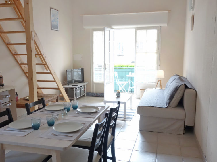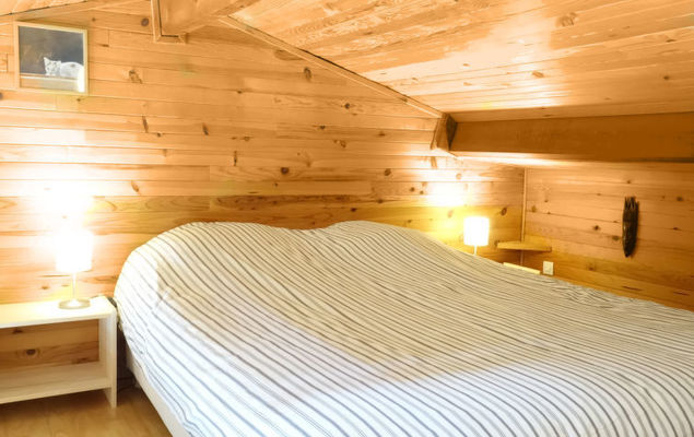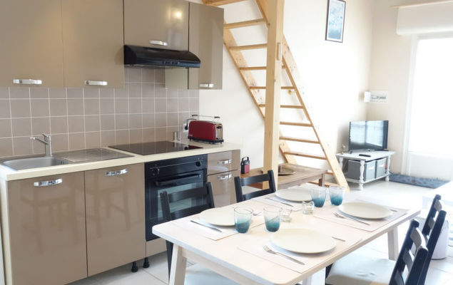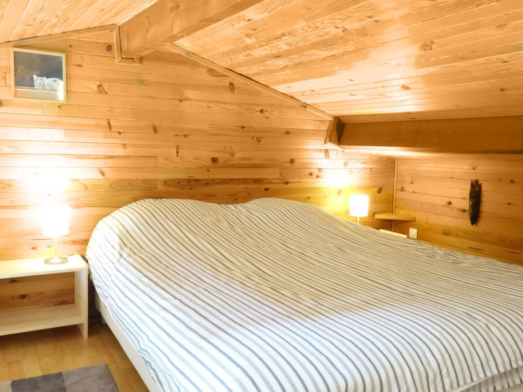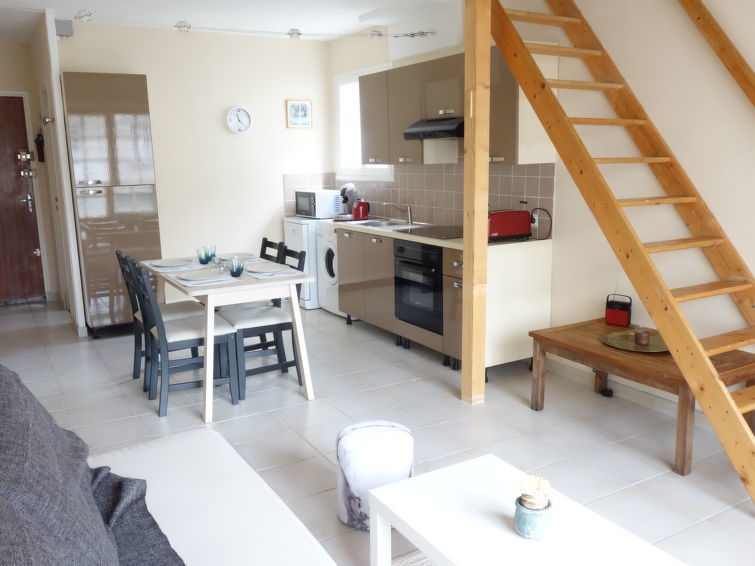 Studio 1-kamer 26 m2 op 2 verdiepingen, op verhoogde begane grond. Mooi ingericht: woon-/eetkamer met 1 2-pers divanbed (1 x 140 cm, lengte 190 cm), TV. Uitgang naar het balkon. Kookhoek (oven, afwasmachine, 2 inductiekookplaten, magnetron, diepvriezer). Douche/WC. Elektrische verwarming. Bovenverdieping: galerij met afgeschuinde daken met 1 2-pers bed (1 x 160 cm, lengte 190 cm). Klein balkon 4 m2, op het zuiden gelegen en op het oosten gelegen. Ter beschikking: wasmachine. Internet (Internet (WiFi), extra). Let op: maximaal 1 huisdier/hond toegestaan. Rookmelders.