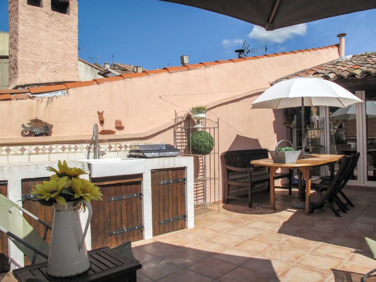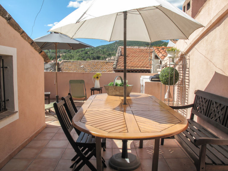 "La Roq", huis in een rij 4-kamers 150 m2 op 4 verdiepingen. Gerenoveerd in 2009, comfortabel en rustiek ingericht: 1 kamer met 2 bedden (90 cm, lengte 200 cm), aparte WC en douche. Bovenverdieping: 1 kamer met 1 2-pers bed (160 cm, lengte 200 cm), bad, aparte WC en dubbele wastafels. 2e Verdieping: woon-/eetkamer met 1 divanbed (160 cm, lengte 200 cm), TV en elektrische verwarming. Keuken (oven, afwasmachine, 4 keramische glas kookplaten, broodrooster, waterkoker, elektrische koffiemachine) met eettafel. 3e Verdieping: salon met 1 divanbed (120 cm, lengte 185 cm). Uitgang naar het terras. Groot terras 40 m2. Terrasmeubelen. Ter beschikking: wasmachine, strijkijzer, kinderbed. Internet (Internet (WiFi), gratis). Let op: rookvrij huis. Rookmelders. 831070007173W