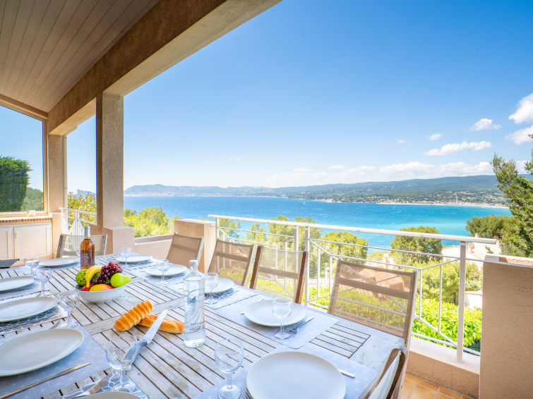 Villa 6-kamers 150 m2. Doelmatig en mooi ingericht: woon-/eetkamer met TV (Flatscreen TV), stereo-installatie en air-conditioning. Uitgang naar het terras. Keuken (oven, afwasmachine, 3 inductiekookplaten, magnetron, diepvriezer, elektrische koffiemachine) met eethoek en TV. Uitgang naar het terras. Douche, aparte WC. Souterrain: kleine woon-/eetkamer met TV en air-conditioning. Uitgang naar het zwembad. Hal met 1 2-pers divanbed (130 cm, lengte 190 cm). 1 kamer met 1 2-pers bed (140 cm, lengte 190 cm). Uitgang naar het zwembad. Kookhoek (2 inductiekookplaten, magnetron). Douche/WC. Bovenverdieping: 1 kamer met 1 2-pers bed (160 cm, lengte 200 cm). Uitgang naar het balkon. 1 kamer met 1 x 2 stapelbedden (90 cm, lengte 190 cm). 1 kamer met 1 2-pers bed (140 cm, lengte 190 cm). Badkamer, aparte WC, dubbele wastafels. Elektrische verwarming, air-conditioning, heteluchtverwarming. Balkon 10 m2, terras 30 m2, overdekt, op het noordwesten gelegen. Terrasmeubelen, barbecue. Mooi panoramazicht op zee en het landschap. Ter beschikking: wasmachine, strijkijzer. Internet (WiFi, gratis). Parkeerplaats (omheind, 2 Auto's). TV alleen FR. Rookmelders. 83112000235CG