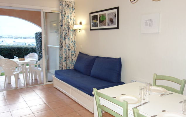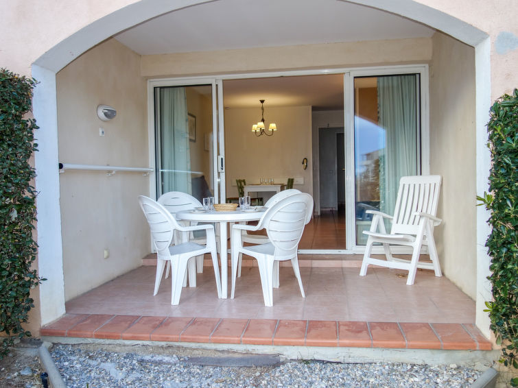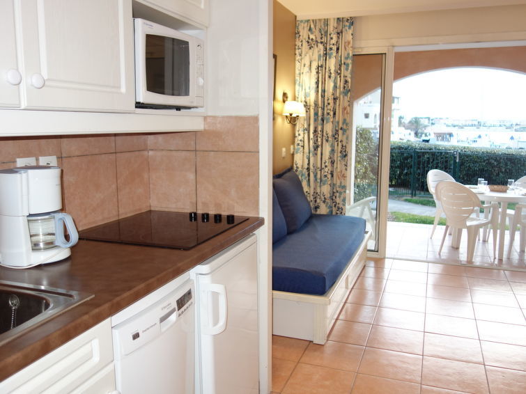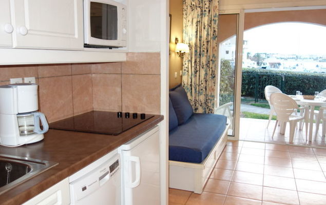 Appartement 2-kamers 32 m2, op de begane grond. Doelmatig en mooi ingericht: woon-/eetkamer met 2 bedden (80 cm, lengte 190 cm), TV (Flatscreen TV). Uitgang naar het terras. 1 kamer met 1 2-pers bed (1 x 140 cm, lengte 190 cm). Kookhoek (afwasmachine, 4 keramische glas kookplaten, broodrooster, waterkoker, magnetron, elektrische koffiemachine). Badkamer, aparte WC. Elektrische verwarming. Terras 8 m2, overdekt, op het zuiden gelegen, kleine zithoek in de tuin 4 m2. Terrasmeubelen. Uitzicht op zee en het zwembad. Parkeerplaats nr. 428 (Niveau P1) (overdekt), hoogte 190 cm, breedte 240 cm. Let op: maximaal 1 huisdier/hond toegestaan. TV alleen FR. Rookmelders.