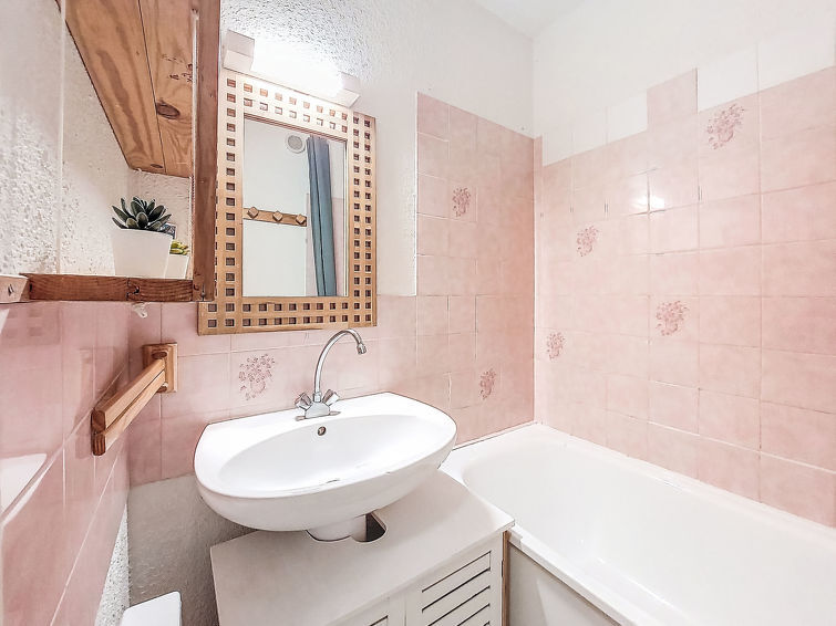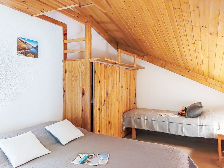 Appartement 2-kamers 32 m2 op de 4e verdieping. Woon-/eetkamer met 1 2-pers divanbed en TV. Uitgang naar het balkon. 1 kamer met 1 2-pers bed. Hal met 1 x 2 stapelbedden. Kookhoek (2-pits kookplaat, oven, broodrooster, waterkoker, elektrische koffiemachine, combimagnetron). Badkamer, aparte WC. Elektrische verwarming. Balkon 3 m2, op het zuidwesten gelegen. Balkonmeubilair. Uitzicht op de bergen. Ter beschikking: kinderbed. Internet (WiFi, extra). TV alleen FR. Rookmelders. Bat F. 74085 000459 OM