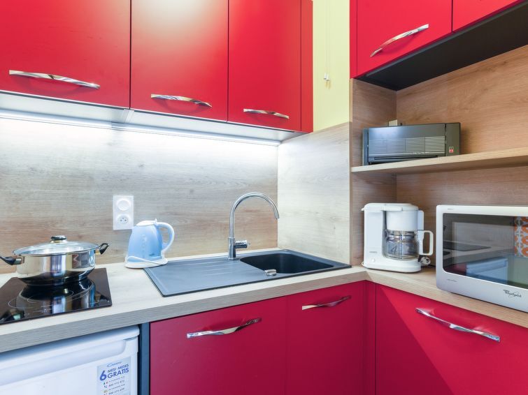 Appartement 1-kamer 32 m2 op de 3e verdieping, op het zuiden gelegen. Eenvoudig ingericht: woon-/eetkamer met gordijn met 1 x 2 stapelbedden (80 cm, lengte 190 cm), TV en DVD. Uitgang naar het balkon, op het zuiden. Slaapnis met gordijn met 1 2-pers bed (140 cm, lengte 200 cm), elektrische rolluiken. Uitgang naar het balkon, op het zuiden. Kleine keuken (afwasmachine, 2 inductiekookplaten, broodrooster, waterkoker, magnetron, elektrische koffiemachine, fondue Set (kaas)). Badkamer, aparte WC. Verwarming. Vloerbedekking. Groot balkon 6 m2, op het zuiden gelegen. Mooi uitzicht op de bergen en de plaats. Ter beschikking: haardroger. Internet (WiFi, extra). Niet rokers woning. Rookmelders. In plaats van een afgesloten slaapkamer bevinden sommige slaapgedeeltes zich in een open ruimte (galerij, nis, etc.). Aanbod door een particulier volgens art. 155, IV van CGI.