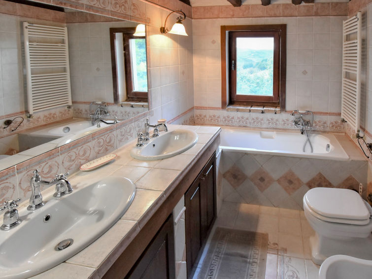 Huis 8-kamers 250 m2 op 2 verdiepingen. Ruim, rustiek en antiek ingericht: open eetkamer met open haard, eettafel en stereo-installatie. Uitgang naar de tuin. Kleine, open woonkamer met Sat-TV. Groot woon-/eetkamer met panoramavenster met open haard. 1 2-pers. kamer. Open keuken (oven, afwasmachine, 4 kookpitten (vlammen), broodrooster, magnetron, diepvriezer, elektrische koffiemachine) met eettafel. Douche/bidet/WC. Bovenverdieping: (trap zonder leuning), 1 2-pers. kamer. 2 kamers, elke kamer heeft 1 bed en 1 2-pers bed. 1 kleine kamer met 2 bedden. Bad/bidet/WC, dubbele wastafels. Gas-verwarming (extra). Verwarming alleen beschikbaar van 15.10. tot 15.04. Comfortabele inrichting in landelijke stijl. Zithoek in de tuin. Terrasmeubelen, barbecue, ligstoelen. Mooi panoramazicht op het dal en het landschap. Ter beschikking: wasmachine, kinderstoel, kinderbed. Internet (WiFi, gratis). Geschikt voor families. Rookvrij huis. Maximaal 2 huisdieren/honden toegestaan. Privé ingang. IT099004B4QHZ3DGJV